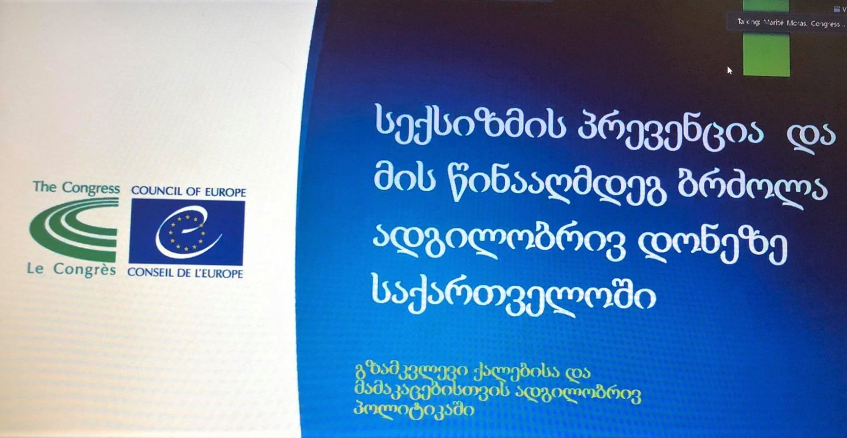 ონლაინ შეხვედრაში, რომელიც გზამკვლევის – „სექსიზმის პრევენცია და ბრძოლა ადგილობრივ დონეზე საქართველოში“ პრეზენტაციას დაეთმო, ცენტრალური და ადგილობრივი ხელისუფლების, ასევე სახალხო დამცველის აპარატისა და საერთაშორისო ორგანიზაციების წარმომადგენლები და ექსპერტები იღებდნენ მონაწილეობას.